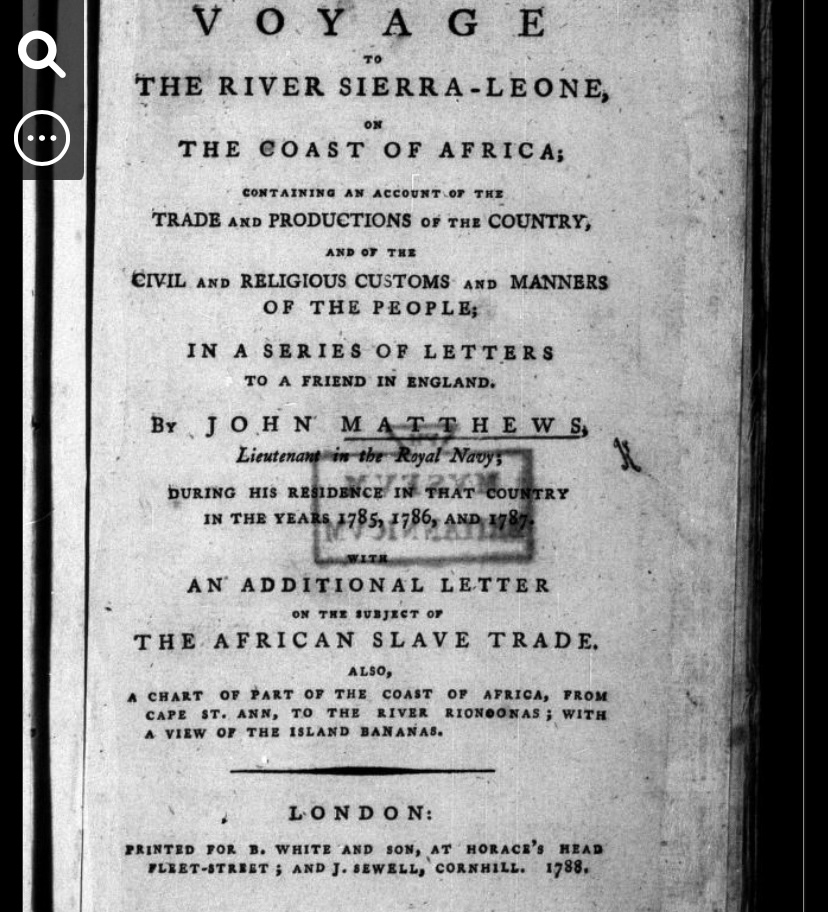 Matthews, John. (1788). *A Voyage to the River Sierra-Leone, on the Coast of Africa*. London: B. White and Son.